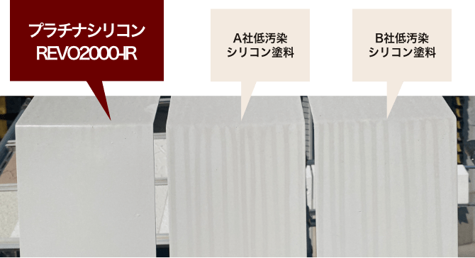 塗膜表面に汚れが付きにくい特殊構造のシリコン樹脂を採用。一般的な低汚染シリコン塗料と比較して雨筋汚れが付きにくく、塗り替え後の美しさを保持することが確認されています。