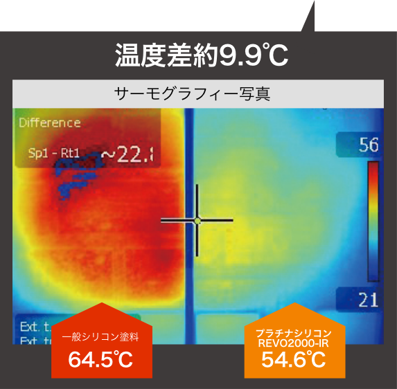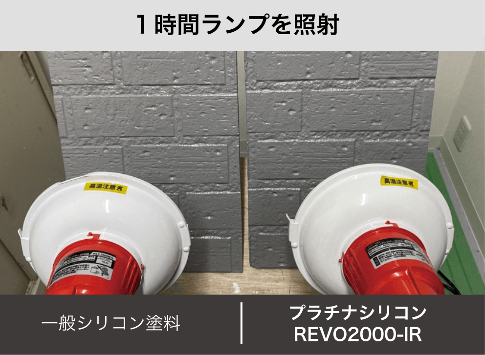 塗料を塗布したサイディングに約1時間ランプ照射し、塗膜の表面温度を測定。一般的な塗料と比較して、約9.9℃の温度差があり、優れた遮熱性を発揮することが確認された。